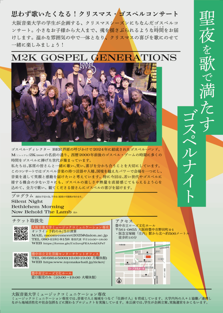 大阪音楽大学の学生が企画する、クリスマスシーズンにちなんだゴスペルコンサート。小さなお子様から大人まで、魂を揺さぶられるような時間をお届けします。